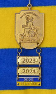 • Een goudkleurig schild met geel-blauw lint